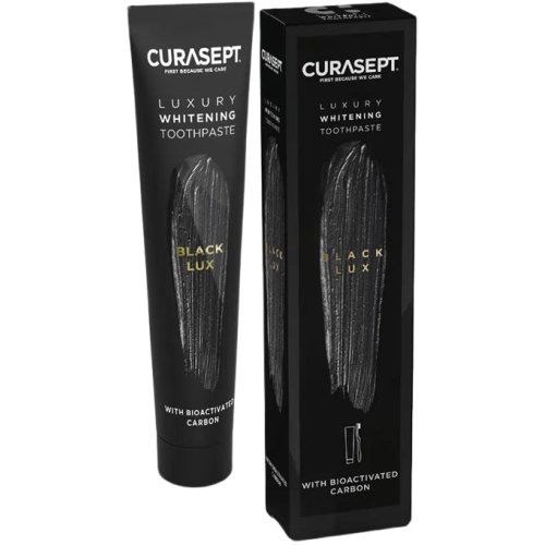 Pasta dentifricia sbiancante di colore nero con carbone bioattivo, idrossiapatite coniugata con chitosano, peroxidone e perossido di carbamide. Spazzolino con setole trattate al Carbone attivo. Gusto Intense mint.